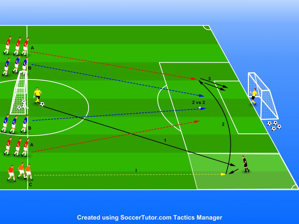 După finalizarea acțiuni jucătorii B primesc mingea și urmează un joc 2 vs 2 + 1 la poarta opusă, jucătorul +1 va fi jucătorul care a centrat, acesta va juca mereu cu cine are mingea.
