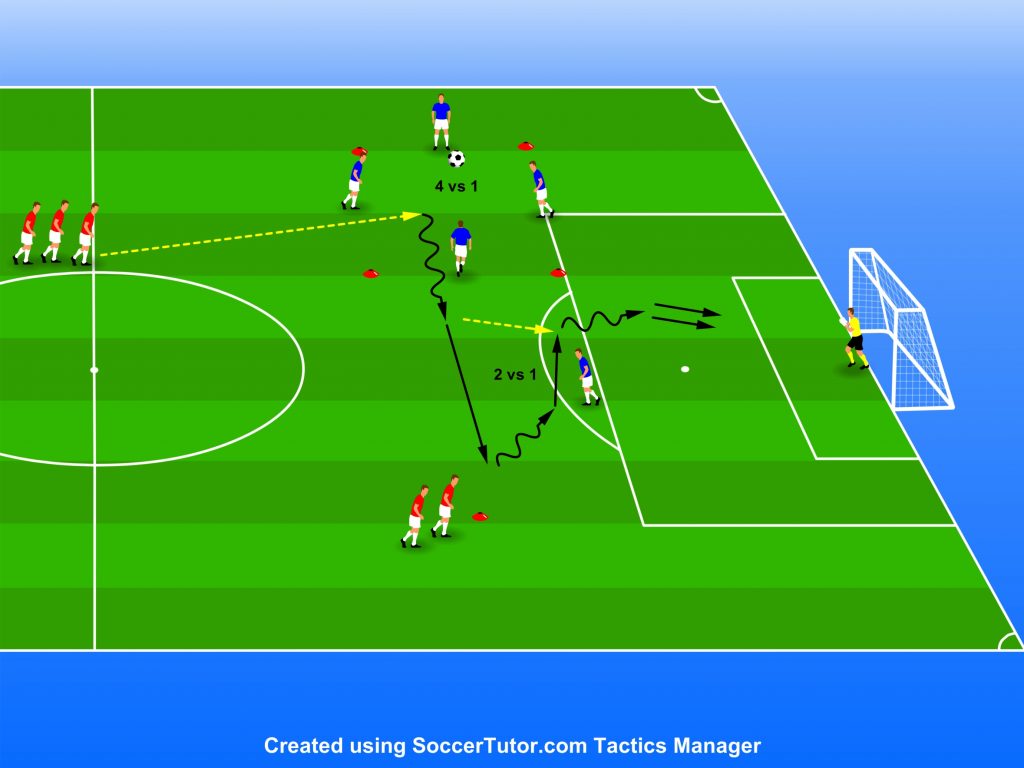 Jucătorii vor fi așezați ca în imagine, exercițiul începe cu o alergare ritm 3/4 a primului jucător roșu din grupa aflată la mijlocul terenului, acesta alergă până în interiorul pătratului de 4 vs 1.