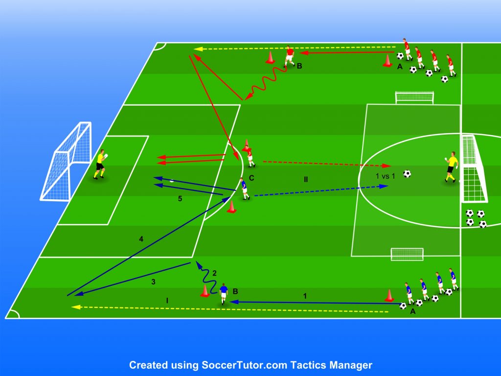 Jucătorul C finalizează rapid la poartă (5). Cei doi jucători C pornesc în alergare până la suprafața de joc de la mijlocul terenului până la minge (II).