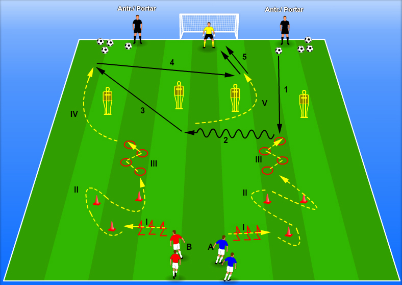 Antrenorul pasează mingea jucătorului A (1), jucătorul A conduce mingea (2) și o pasează pe poziție viitoare (II) jucătorului B (3).