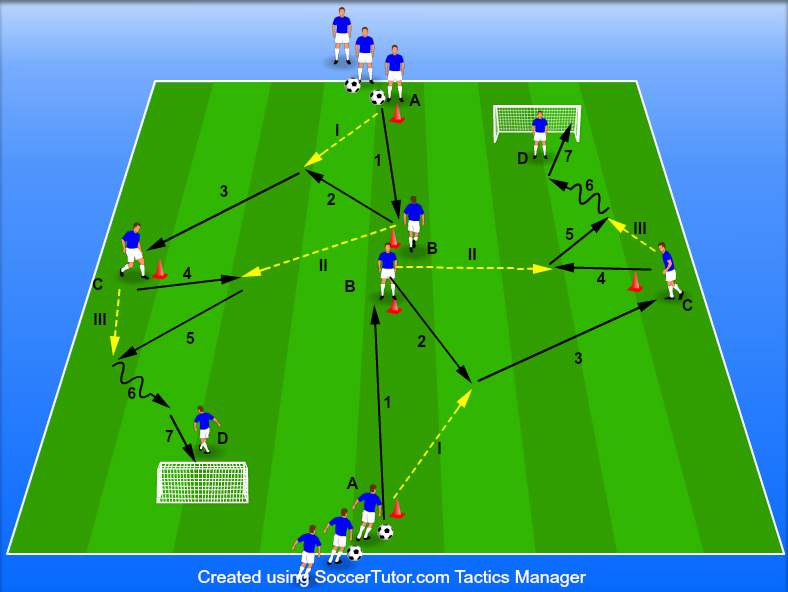 Jucătorul C pasează mingea jucătorului B (4), acesta vine spre minge (II) și o pasează jucătorului C (5) pe poziție viitoare (III).