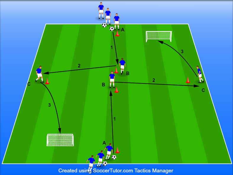 Jucătorul A pasează mingea jucătorului B (1), jucătorul B pasează mingea jucătorului C (2), jucătorul C introduce mingea în poarta de 5 metri (3).