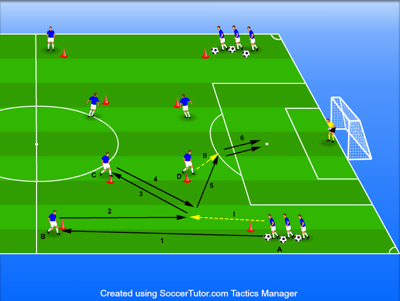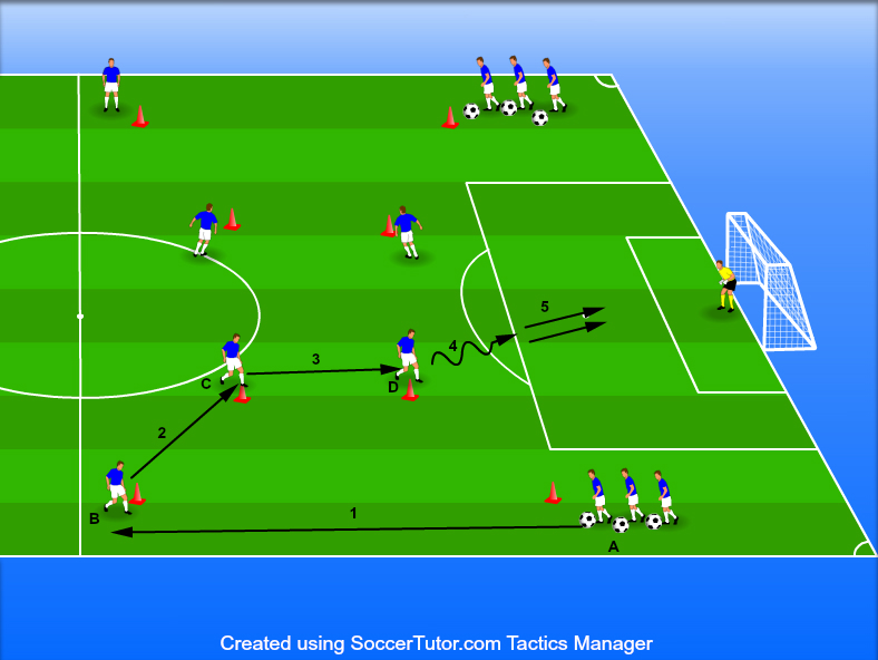 Jucătorul A pasează mingea jucătorului B (1), jucătorul B pasează mingea jucătorului C (2), jucătorul C pasează mingea jucătorului D (3), acesta din urmă intră în posesia mingii o conduce câțiva metri și finalizează acțiunea cu șut la poartă (4-5).