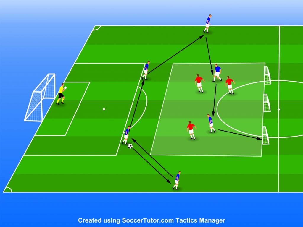 Mijlocașii centrali după ce au primit mingea pot intra în combinații cu fundașii laterali pentru a marca în una din cele trei porți. Cei trei jucători roșii dacă recuperează mingea încearcă să marcheze gol la poarta mare.