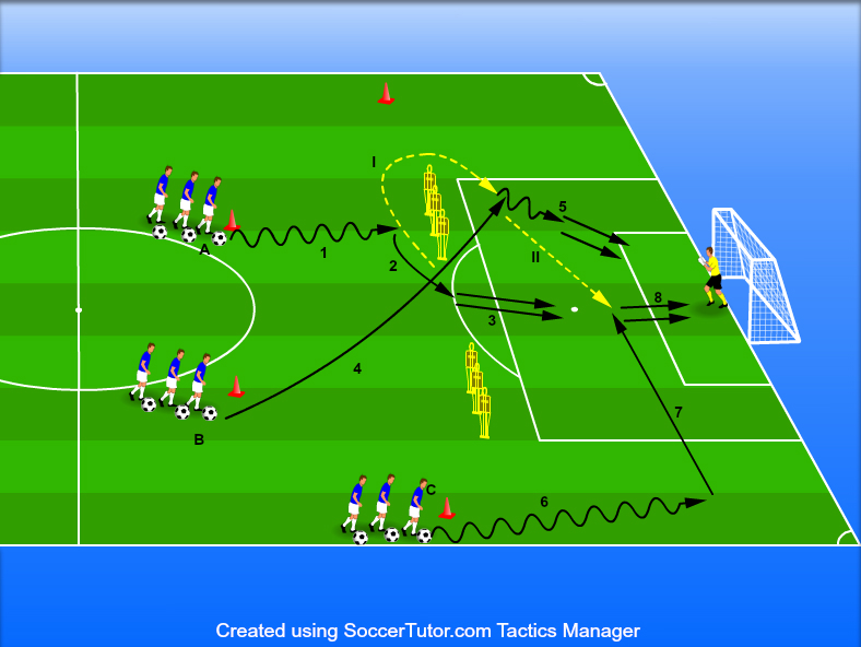 Jucătorul A începe exercițiul prin conducerea mingii până aproape de jaloanele cu vârf, execută un dribling scurt și finalizează cu șut la poartă (1,2,3).