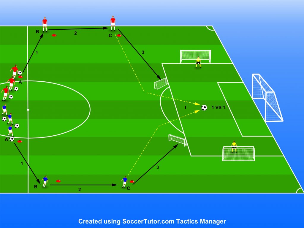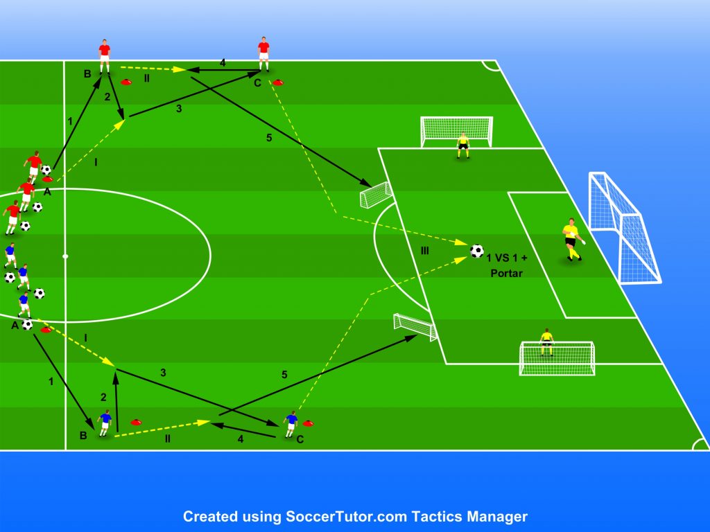 Jucătorii A pasează mingea jucătorilor B (1), jucătorii B pasează mingea jucătorilor C (2), jucătorii C introduc mingea în poarta mică de 1 m (3), după care aleargă până în mijlocul suprafeței de 16 metri (I), unde urmează un duel 1 vs 1.